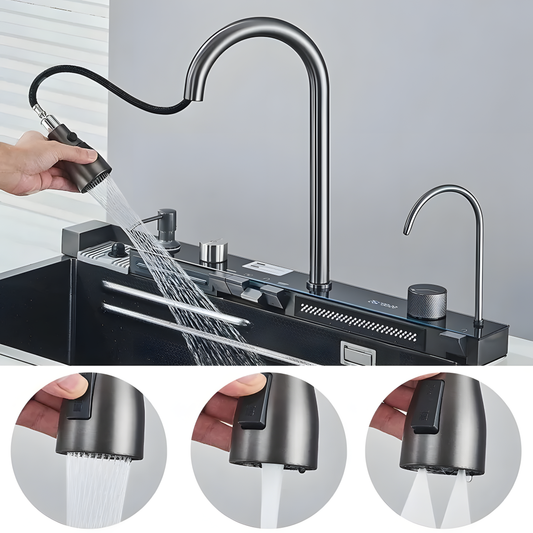 Chiuvetă Bucătărie Multifuncțională 7546HMSF – Gri Gun Metal, Cu Tocător, Dozator și Afișaj Digital
