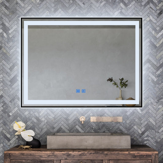 Oglindă baie LED H-130 cu ramă aluminiu negru, 3 nuanțe de lumină, anti-aburire și touch