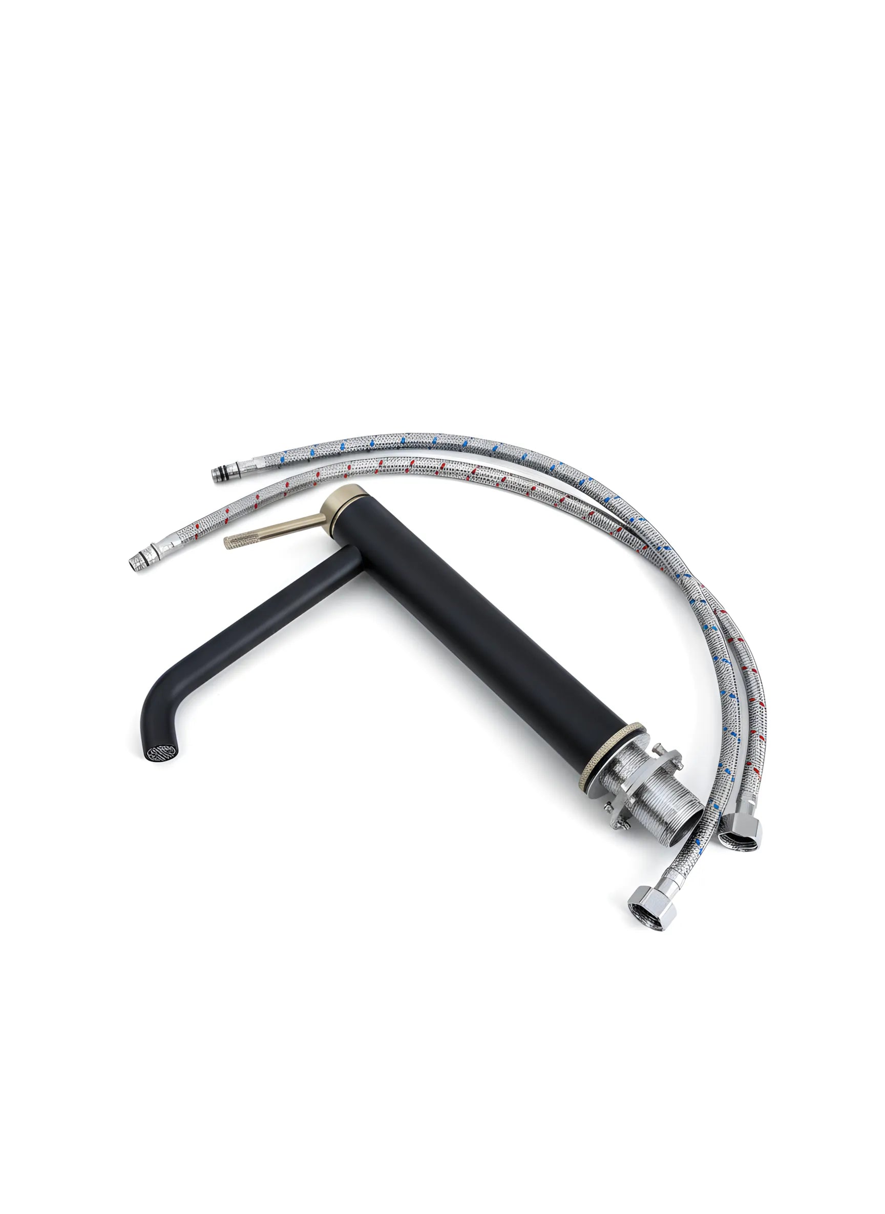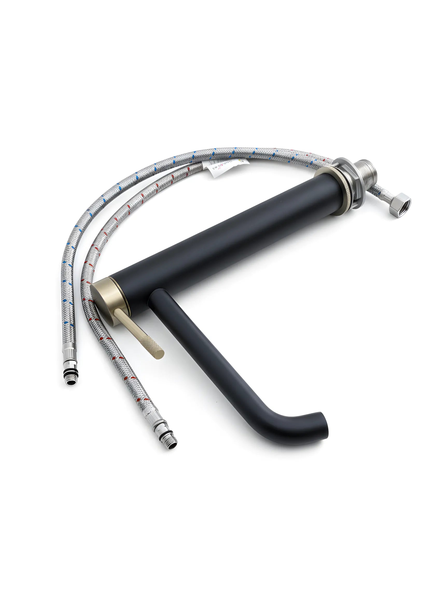 Baterie lavoar negru mat si auriu periat cu mâner zimțat