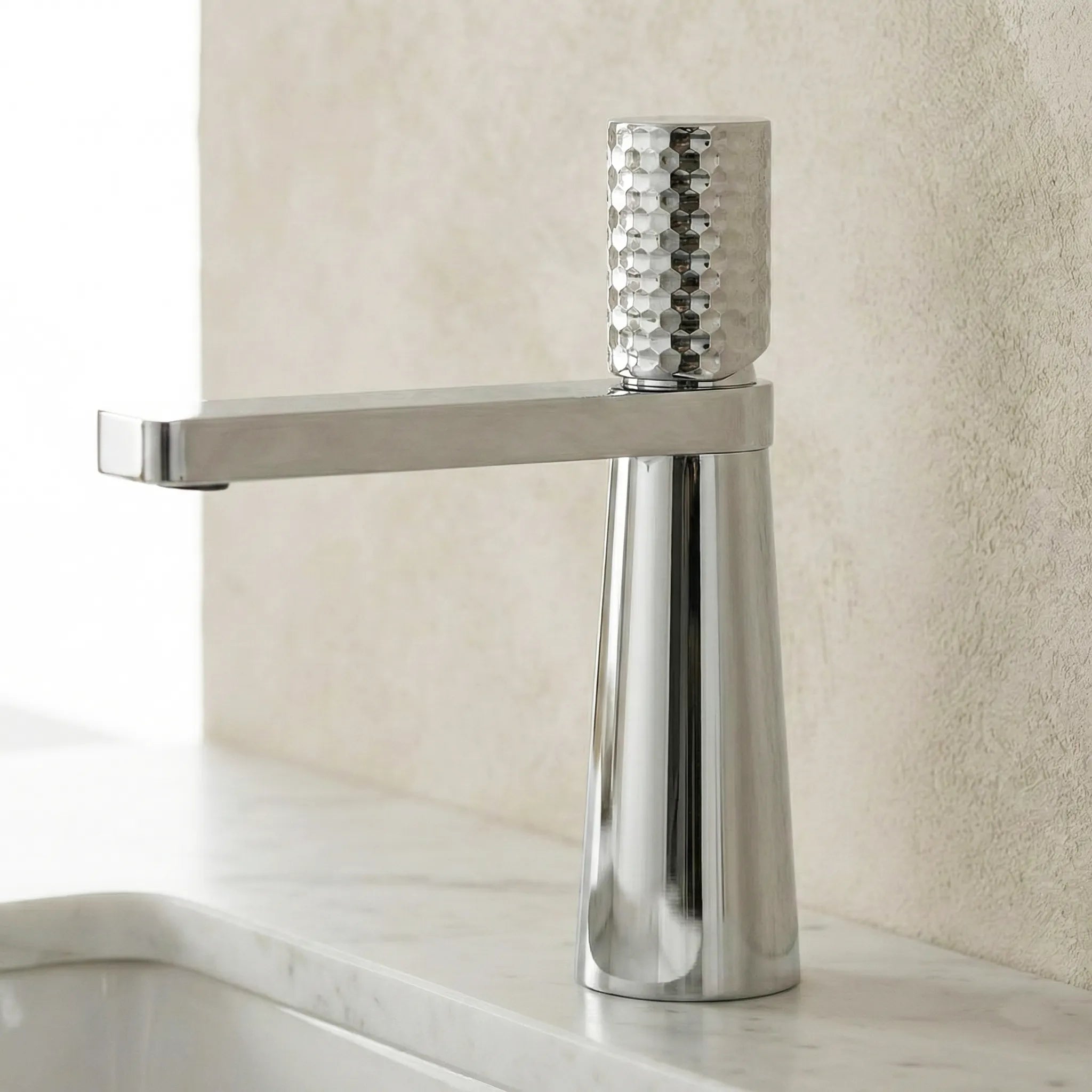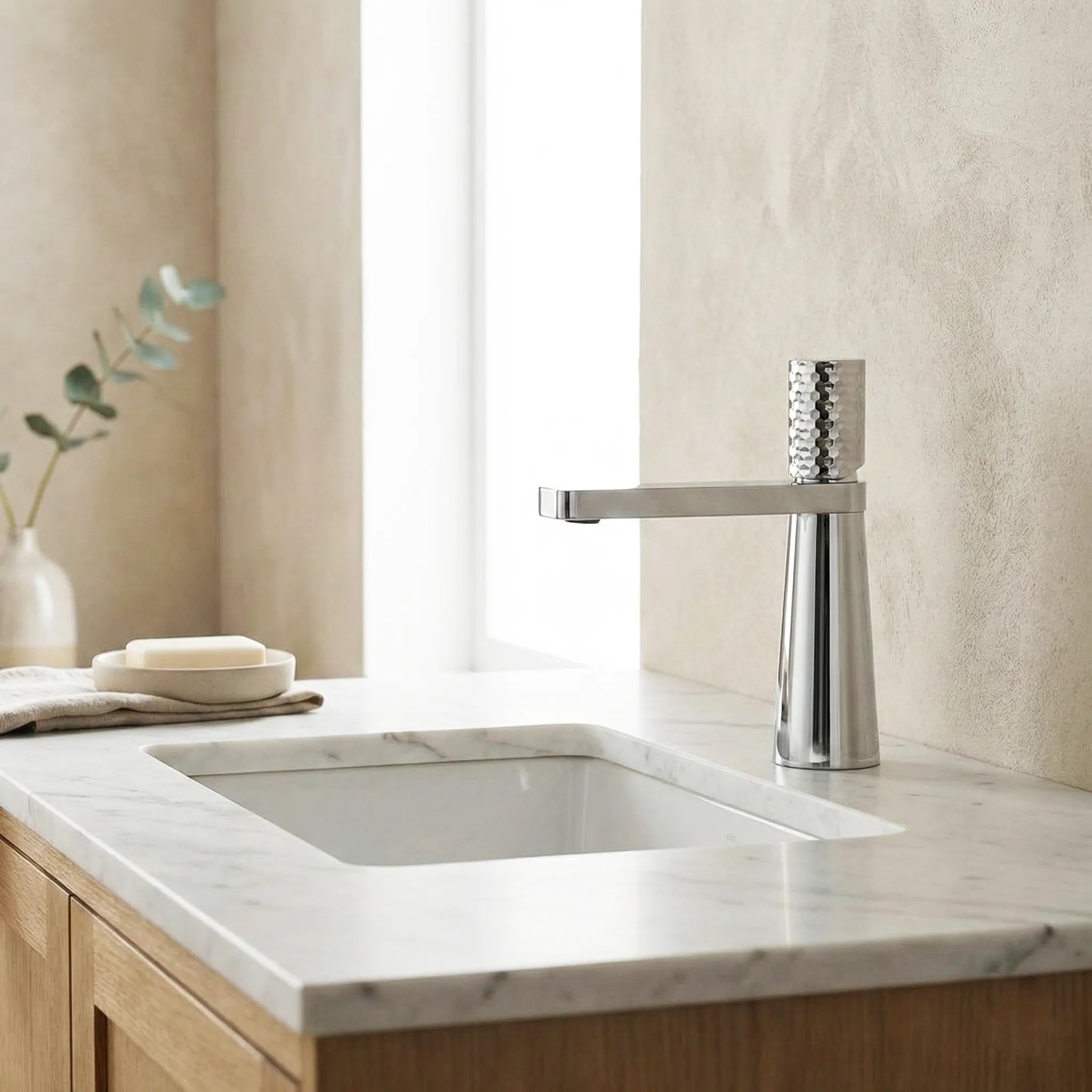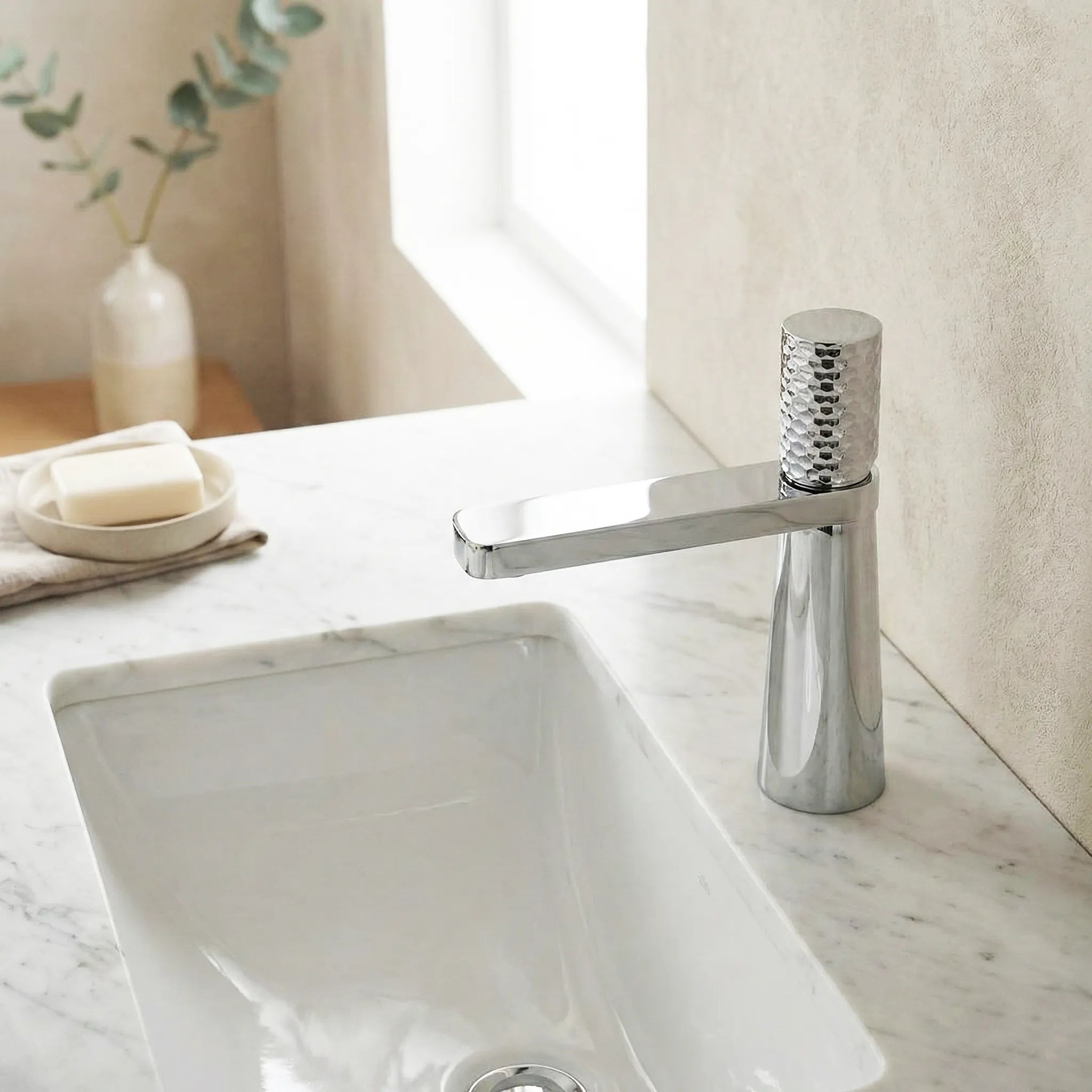 O baterie de lavoar cu prezență sculpturală și detalii rafinate. Modelul din colecția Astrid impresionează prin finisajul crom lucios și textura ciocănită, aducând un accent artistic și elegant în orice baie contemporană.