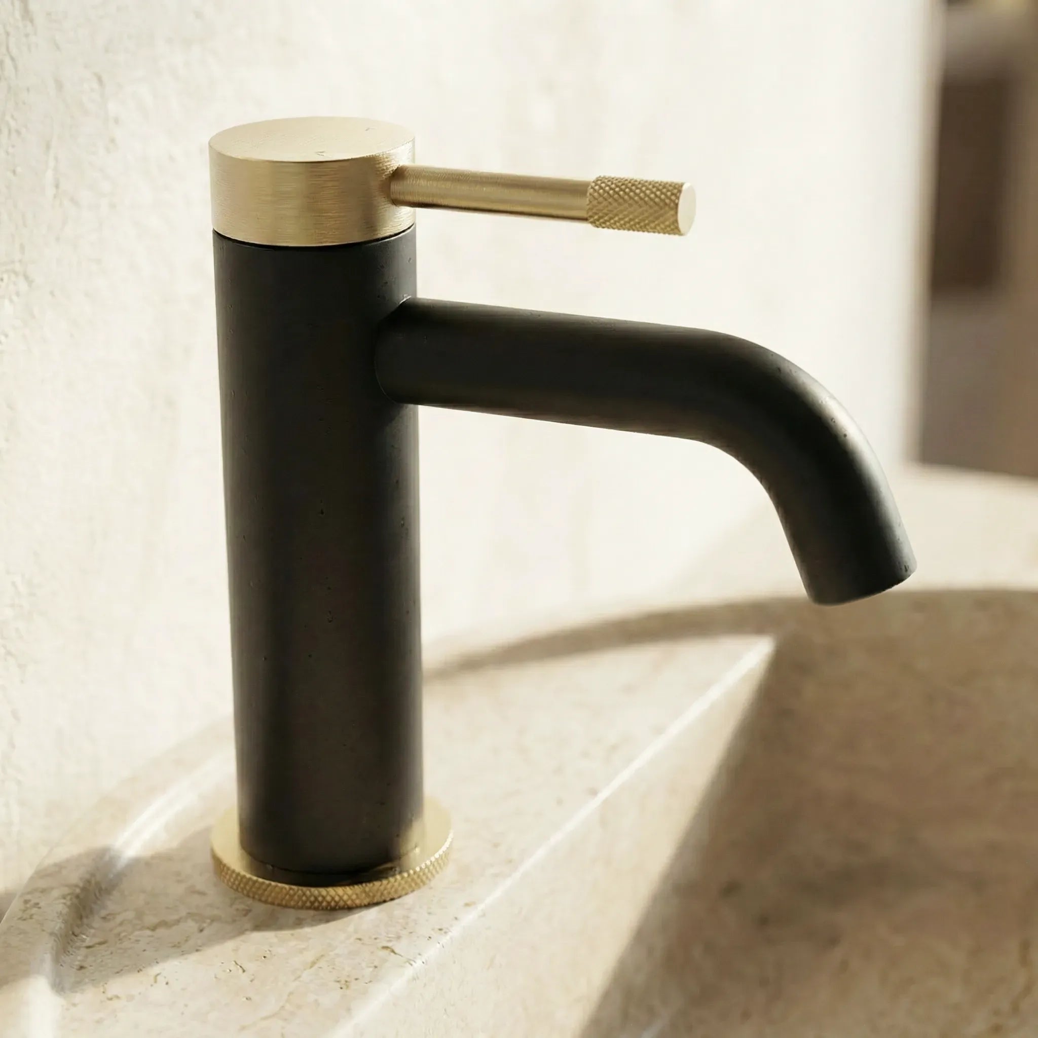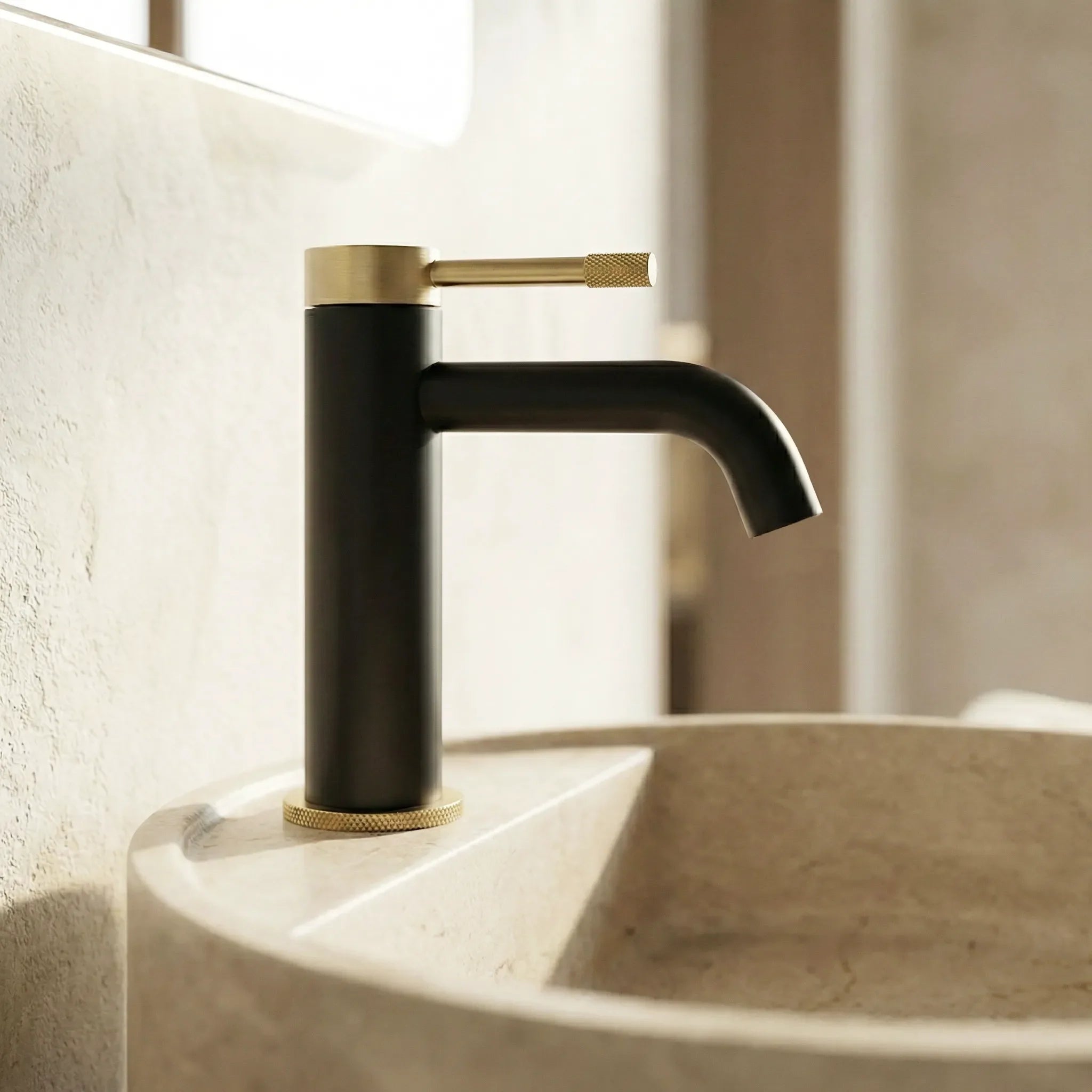 Un mix sofisticat între design industrial și eleganță contemporană, bateria de lavoar Vanolu se remarcă prin finisajul contrastant negru mat cu accente auriu periat și prin detaliile zimțate atent lucrate. Este alegerea ideală pentru băi moderne, proiecte premium sau spații cu personalitate puternică.