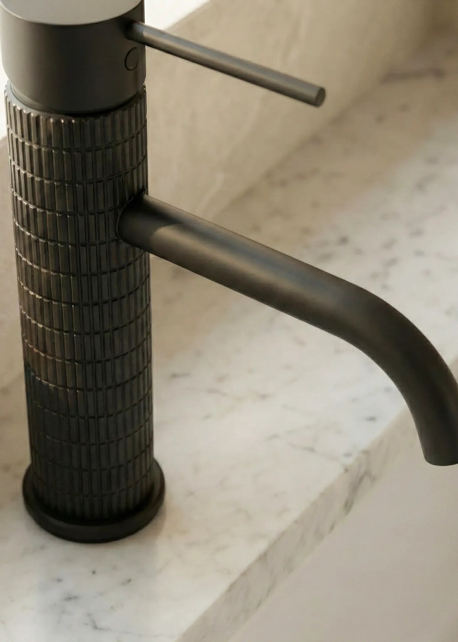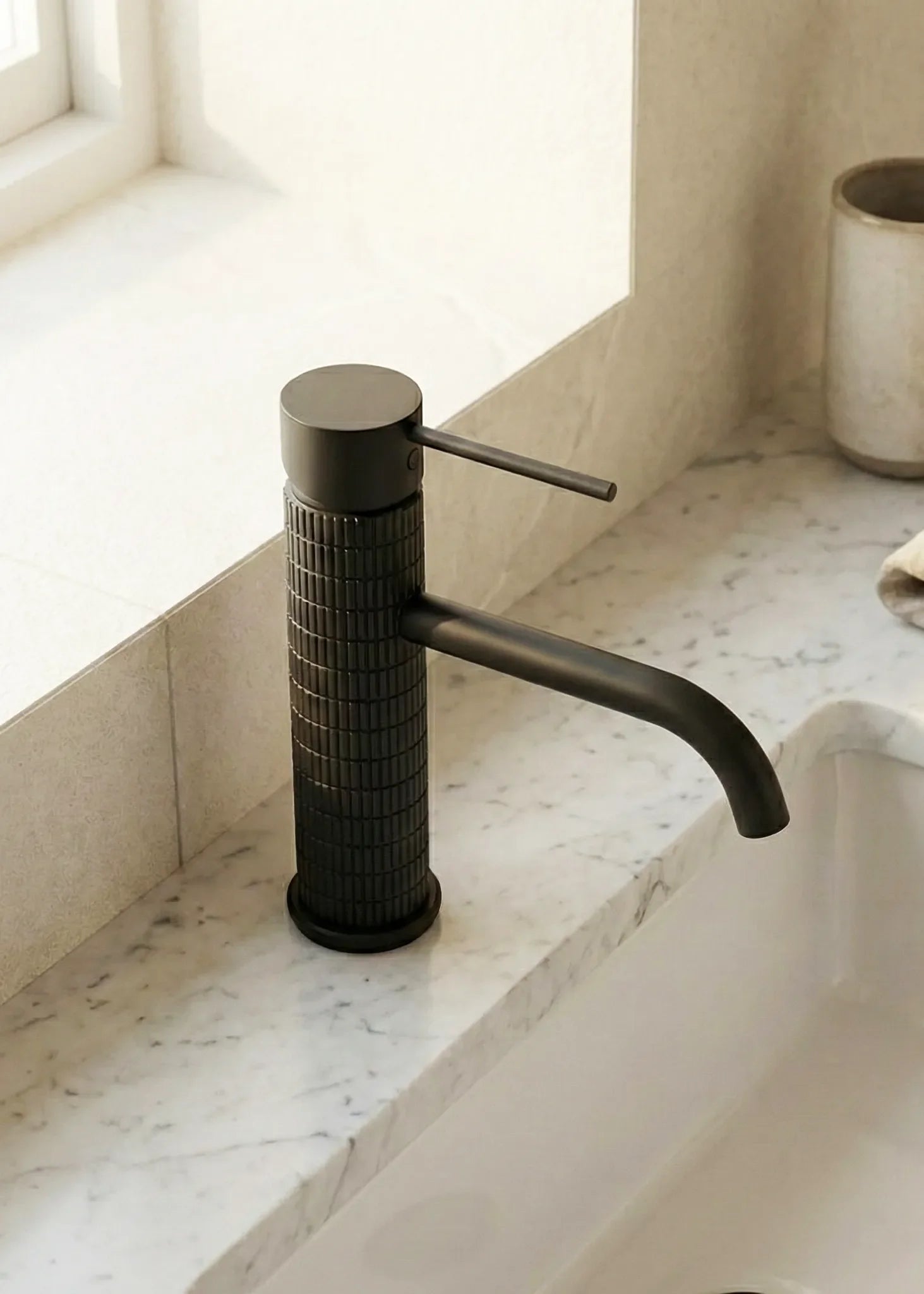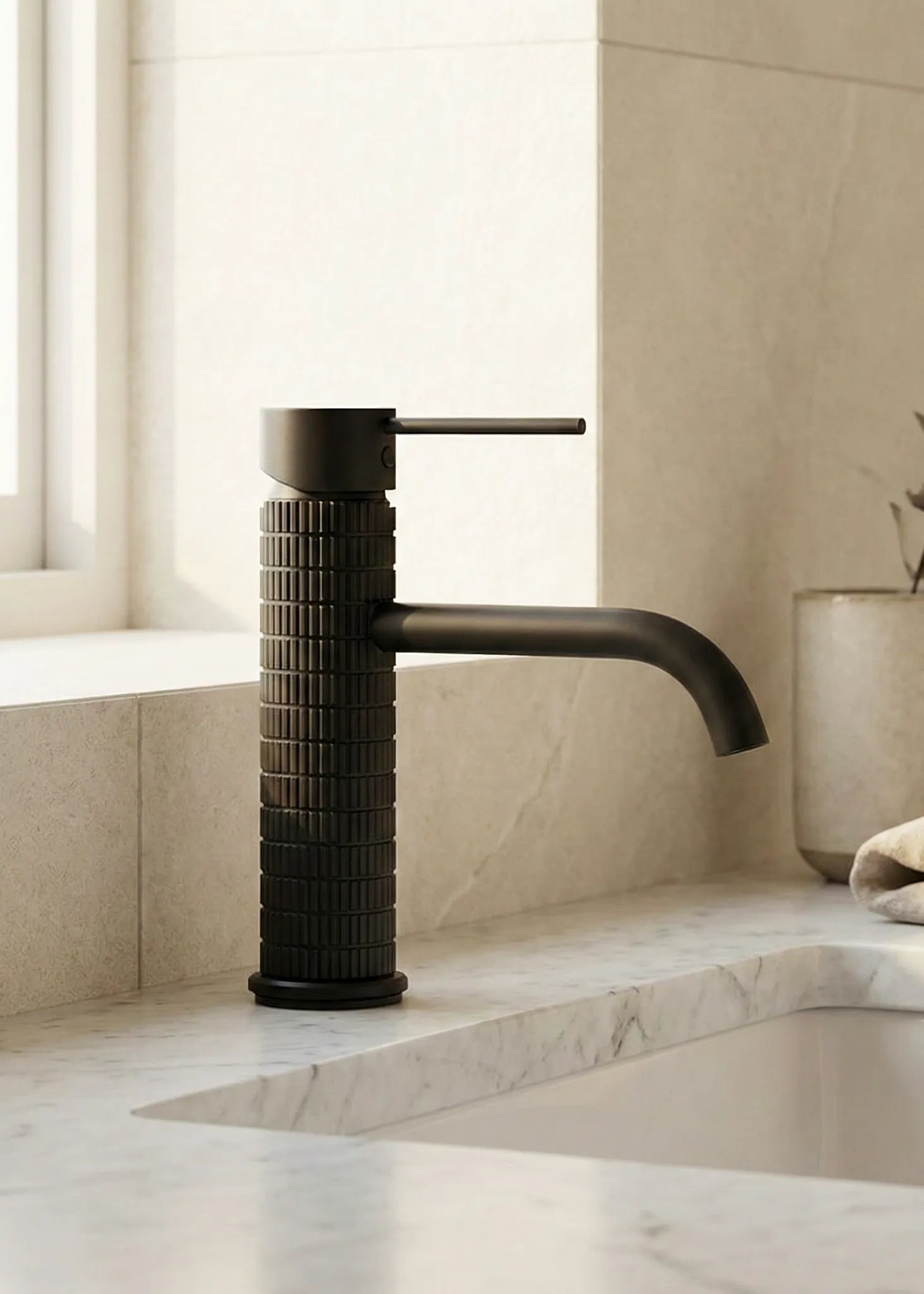 O baterie de lavoar cu design contemporan, care aduce rafinament și prezență vizuală în orice baie modernă. Modelul Elion se remarcă prin finisajul negru mat și textura canelată fin lucrată, combinând estetica sofisticată cu durabilitatea materialelor premium.