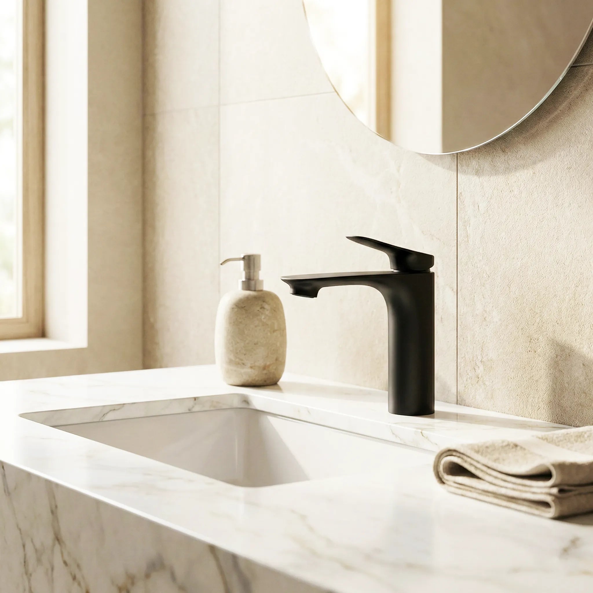O baterie de lavoar modernă, care adaugă un accent sofisticat băii tale. Modelul Rinel combină designul minimalist cu finisajul negru mat, oferind un aspect contemporan și elegant, perfect pentru spațiile moderne sau industriale.