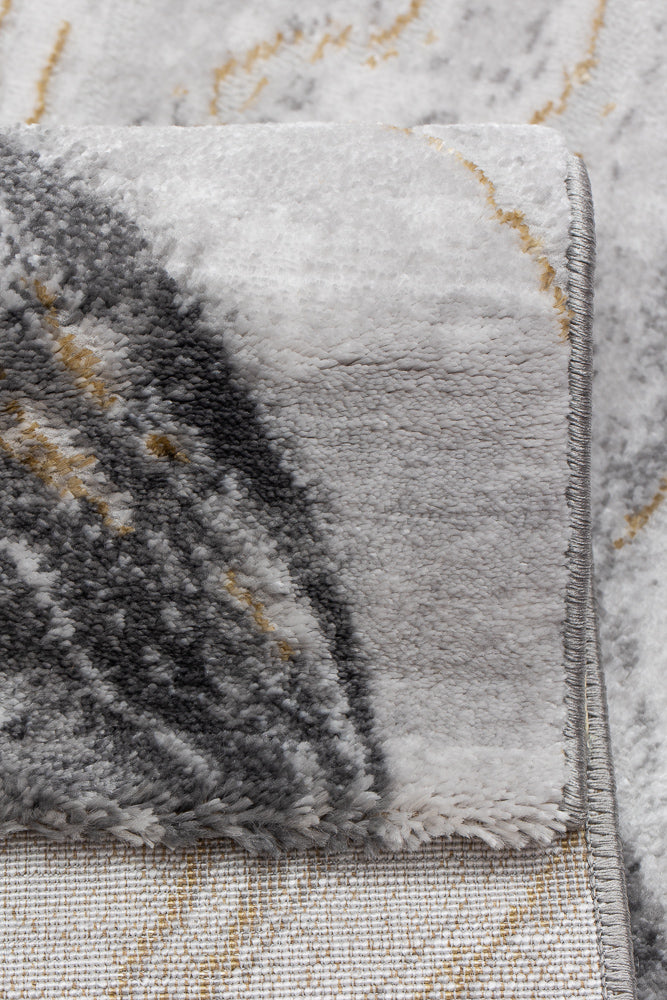 Covorul San Marco Grey Antracit impresionează prin designul său inspirat din nervurile marmurei naturale, reinterpretate în tonuri moderne de gri și antracit, cu inserții aurii subtile. Creează un contrast vizual puternic și transformă orice cameră într-un spațiu sofisticat.