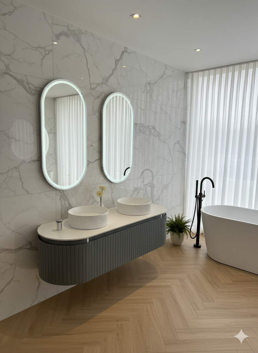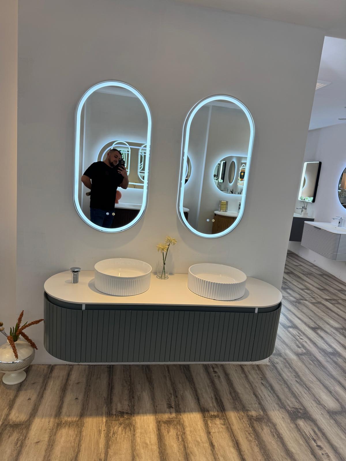 Mobilier baie suspendat dublu cu lavoare și oglinzi LED – Design modern, 160 cm