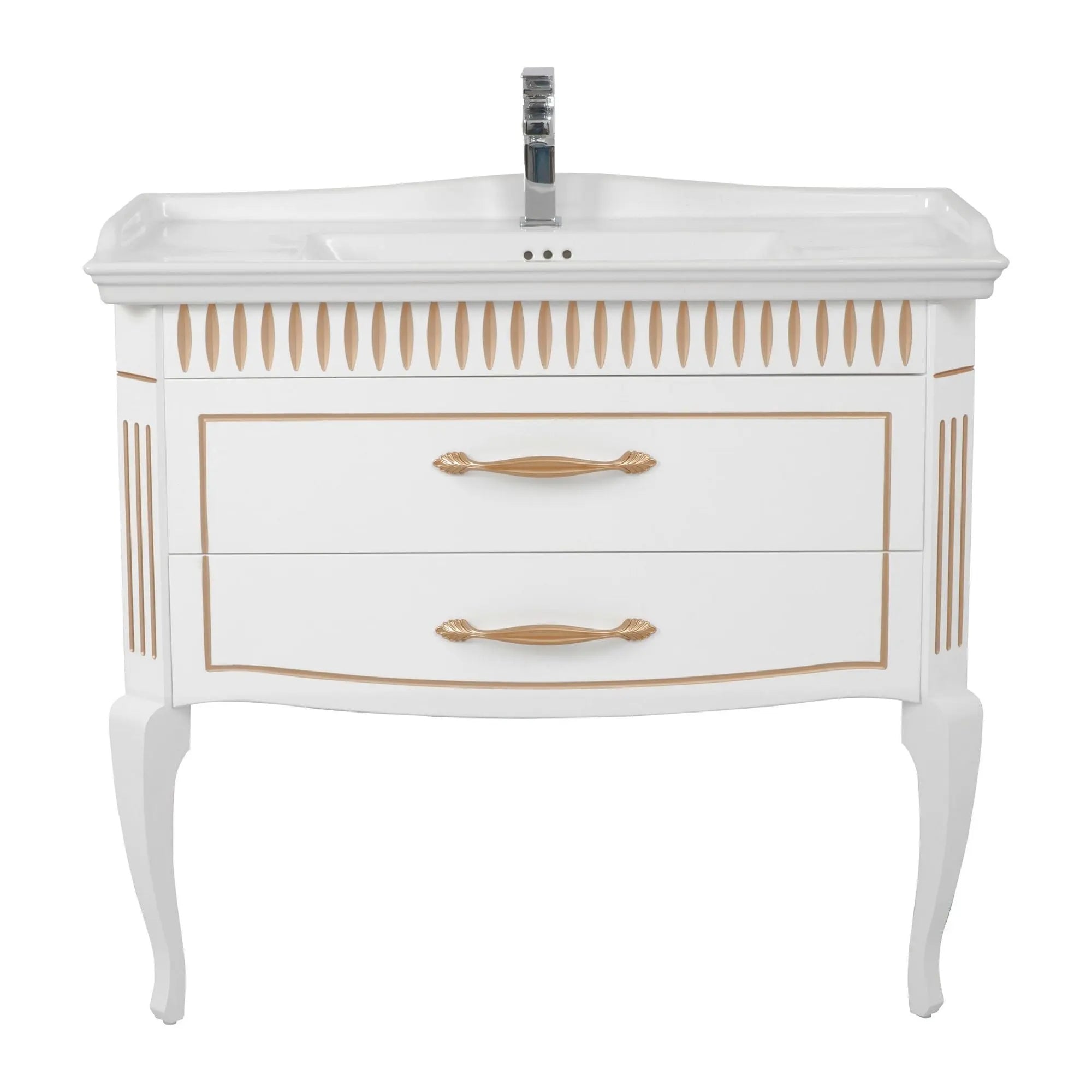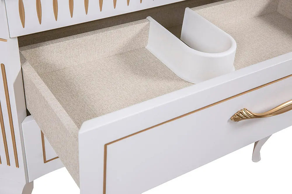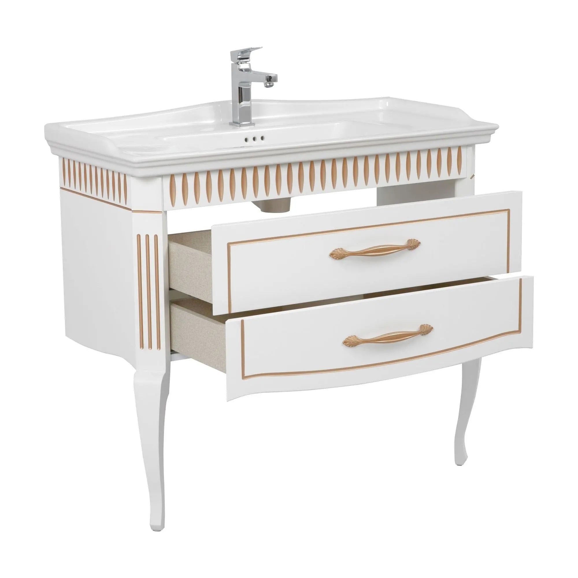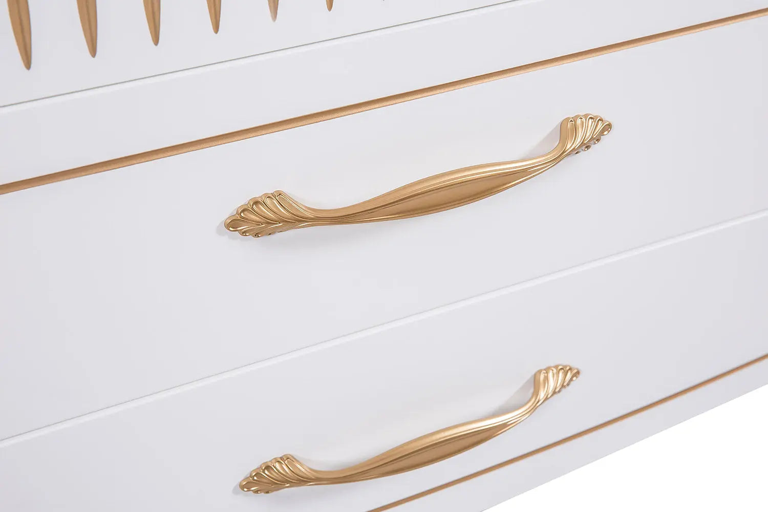 Experimentați rafinamentul și luxul regal cu mobilierul de baie din colecția Royal. Fiecare piesă este realizată cu migală din MDF vopsit alb și îmbogățit cu o patină aurie aplicată manual, conferind un farmec aparte fiecărui detaliu. Procesul de fabricație implică, de asemenea, utilizarea lemnului masiv de frasin, oferind mobilierului durabilitate și noblete.