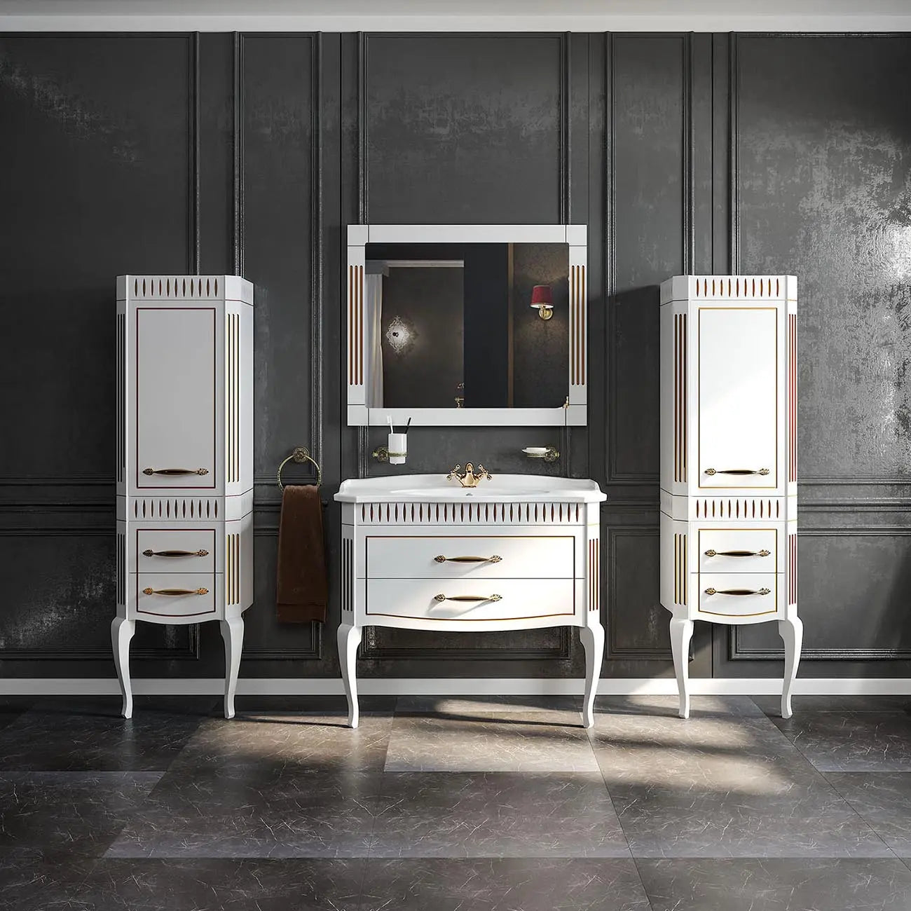 Designul clasic și elegant al colecției Royal se distinge prin linii rafinate și contururi îmbinate cu patina aurie ce adaugă o notă de opulență. Culoarea albă conferă mobilierului un aspect luminos și nobil, integrându-se perfect în orice baie ce îmbrățișează stilul clasic.