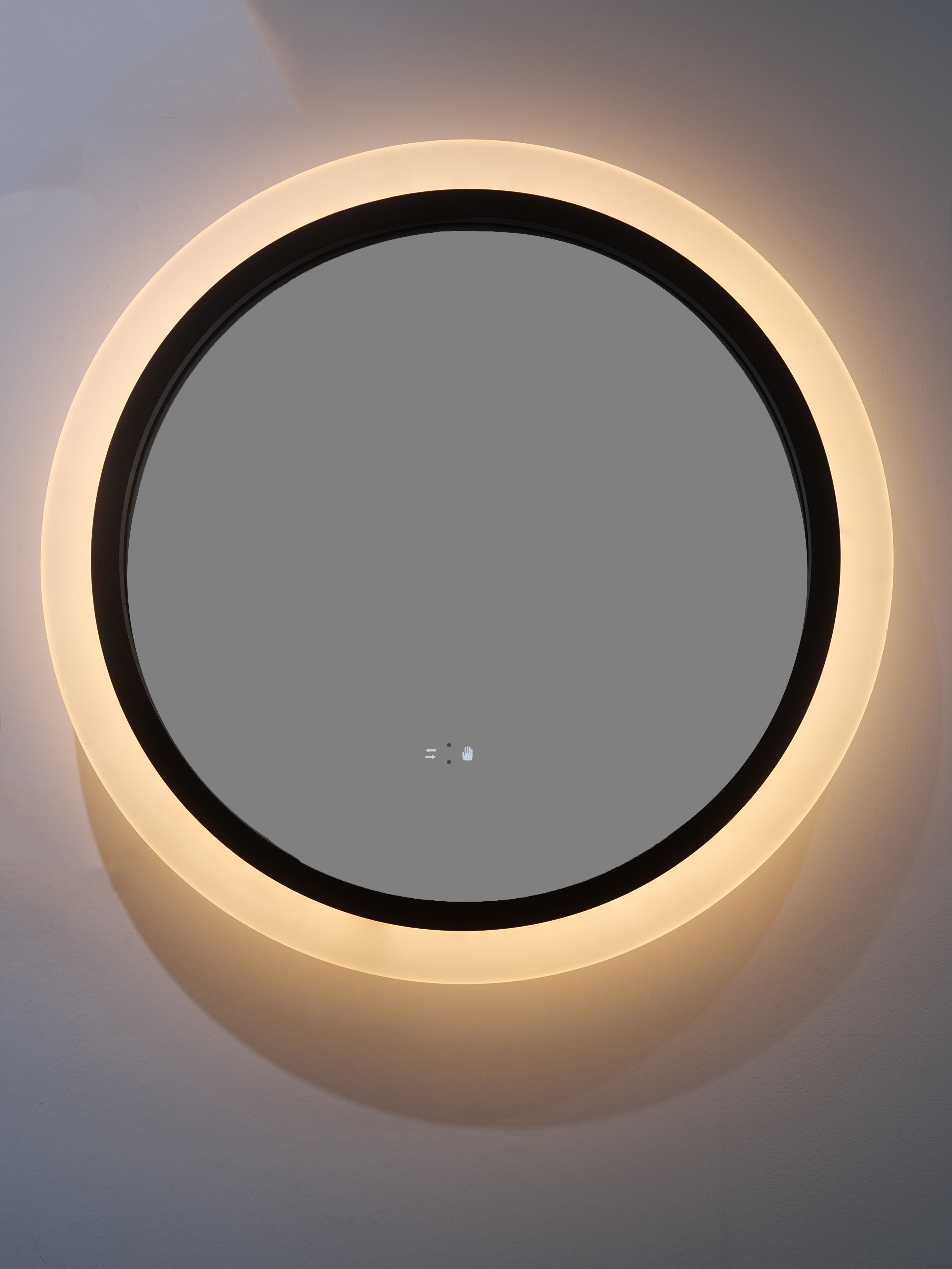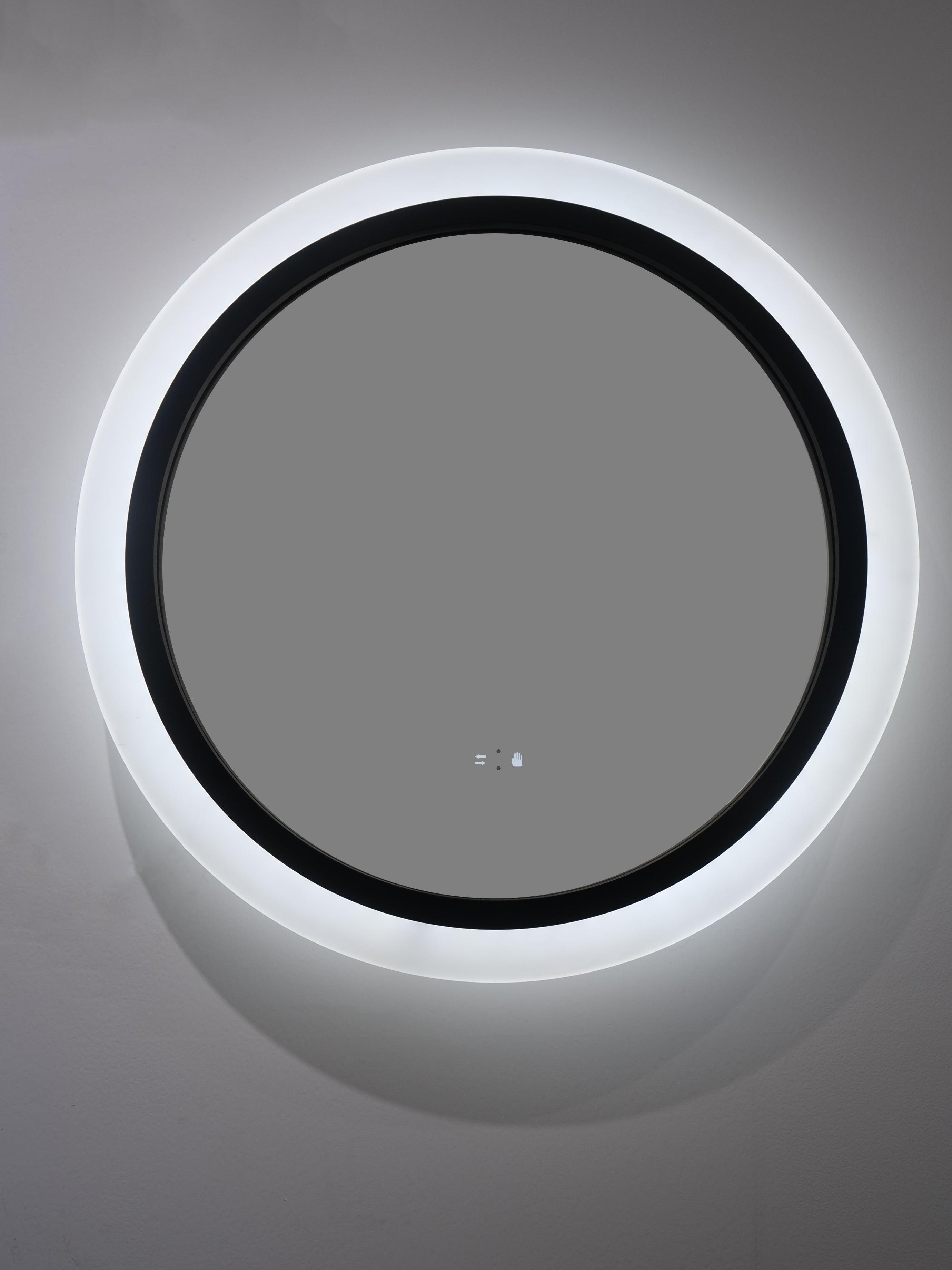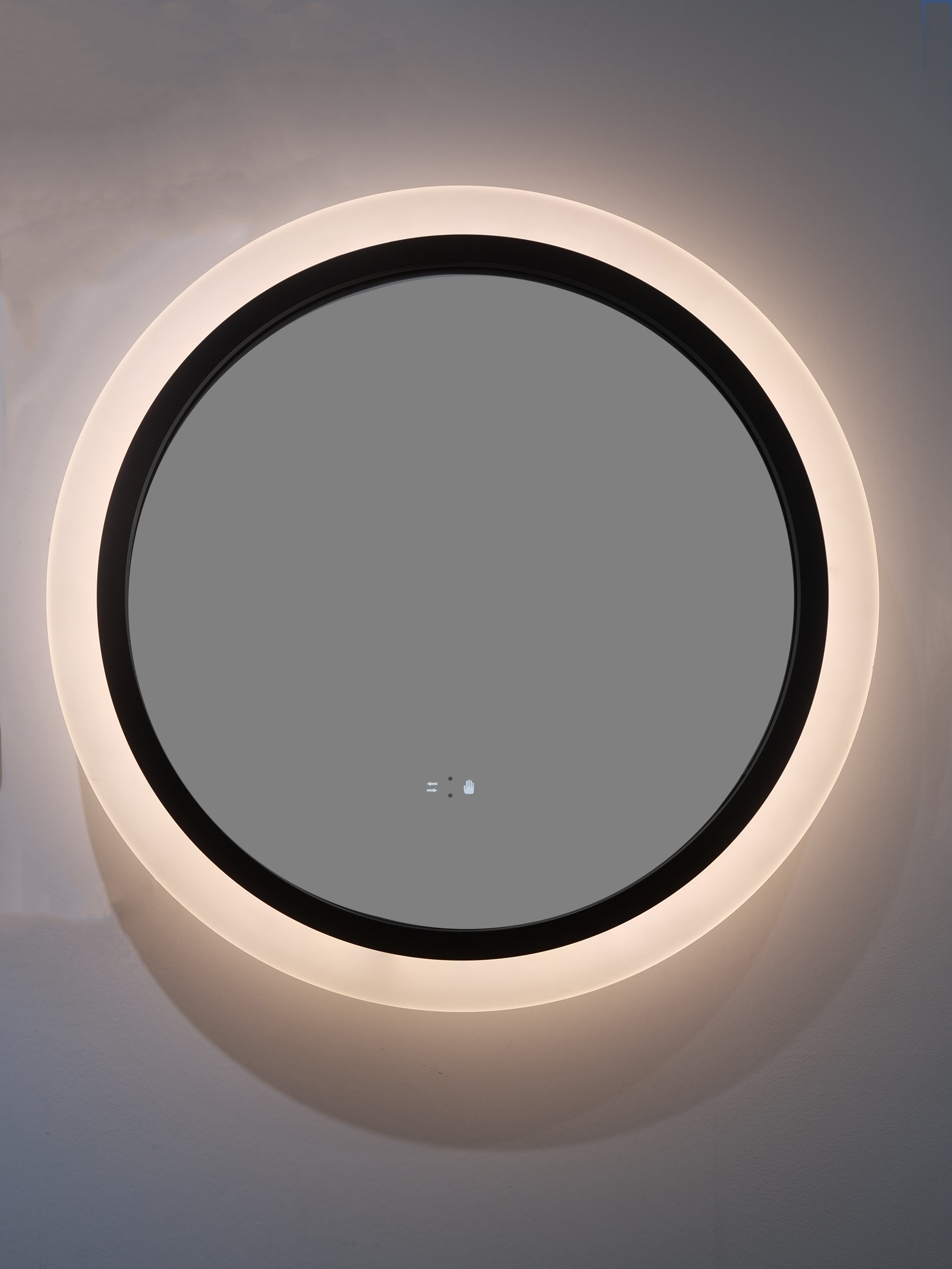 Oglindă rotundă cu LED H-2022, ramă acril + aluminiu negru, 3 nuanțe de lumină, anti-aburire, senzor infraroșu & comutator tactil