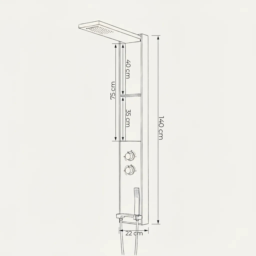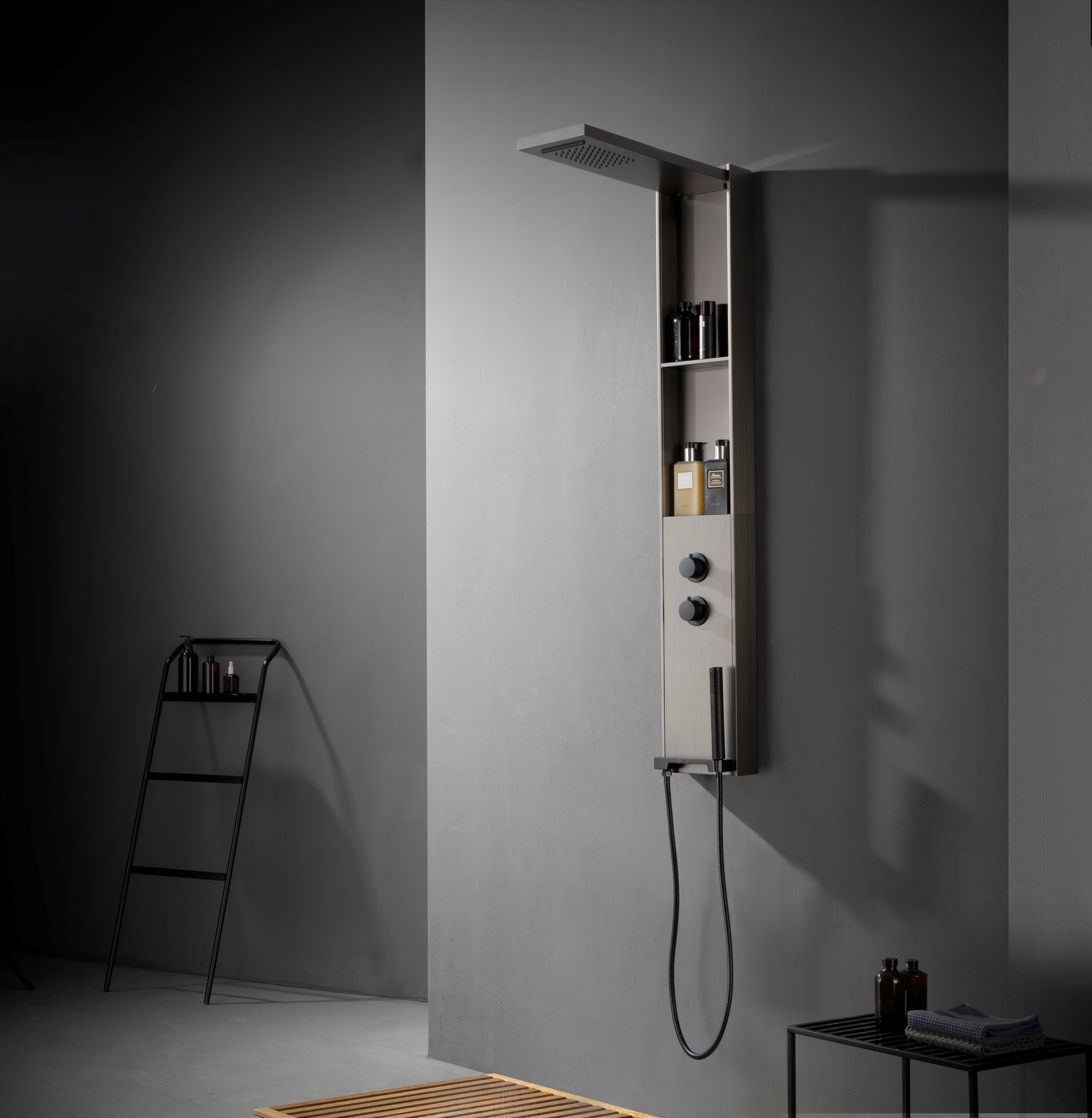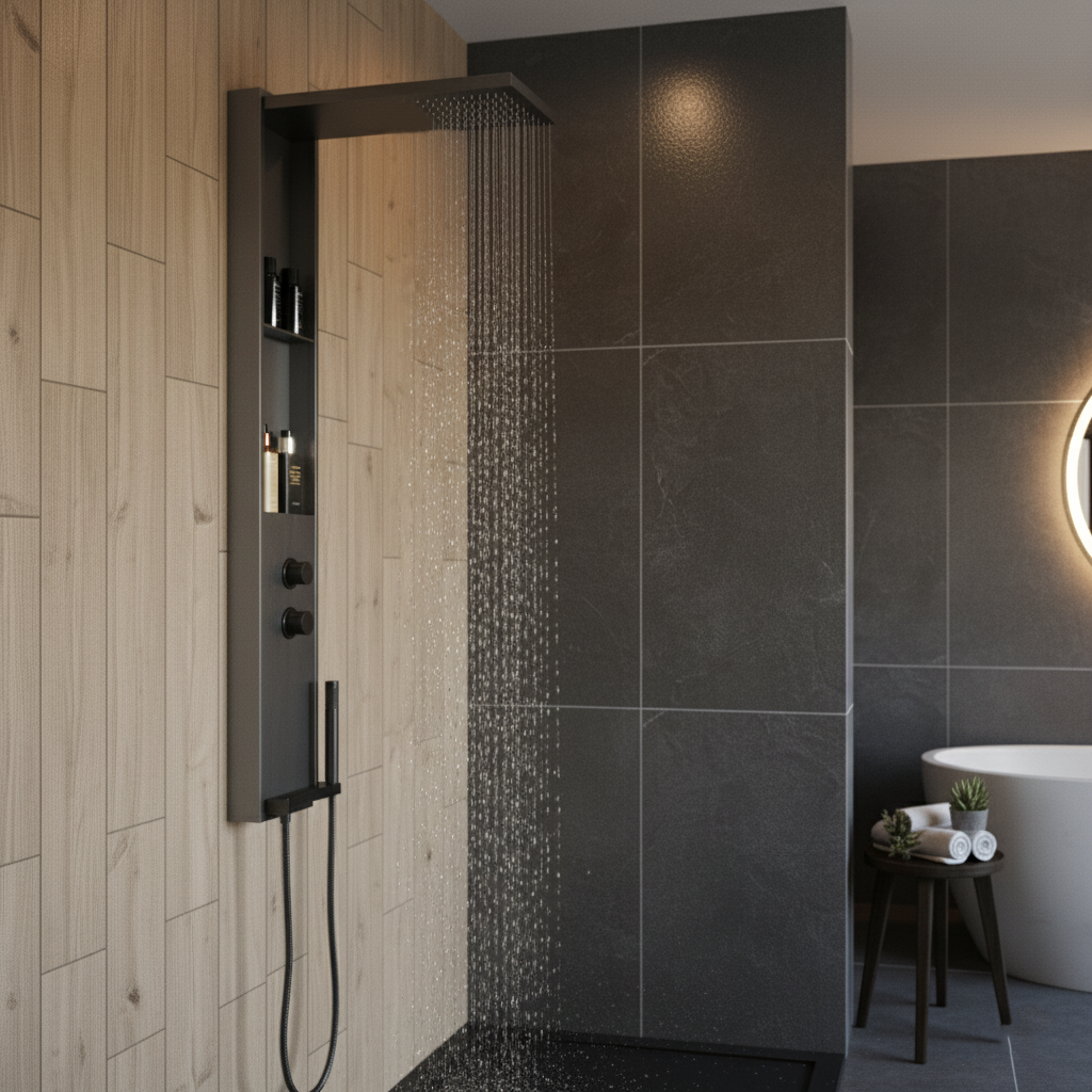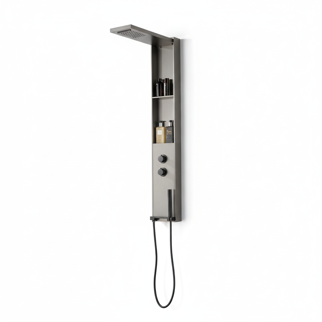 Panel de Duș Gun Metal – Design Minimalist cu Duș Fix, Rafturi Integrate și Duș de Mână