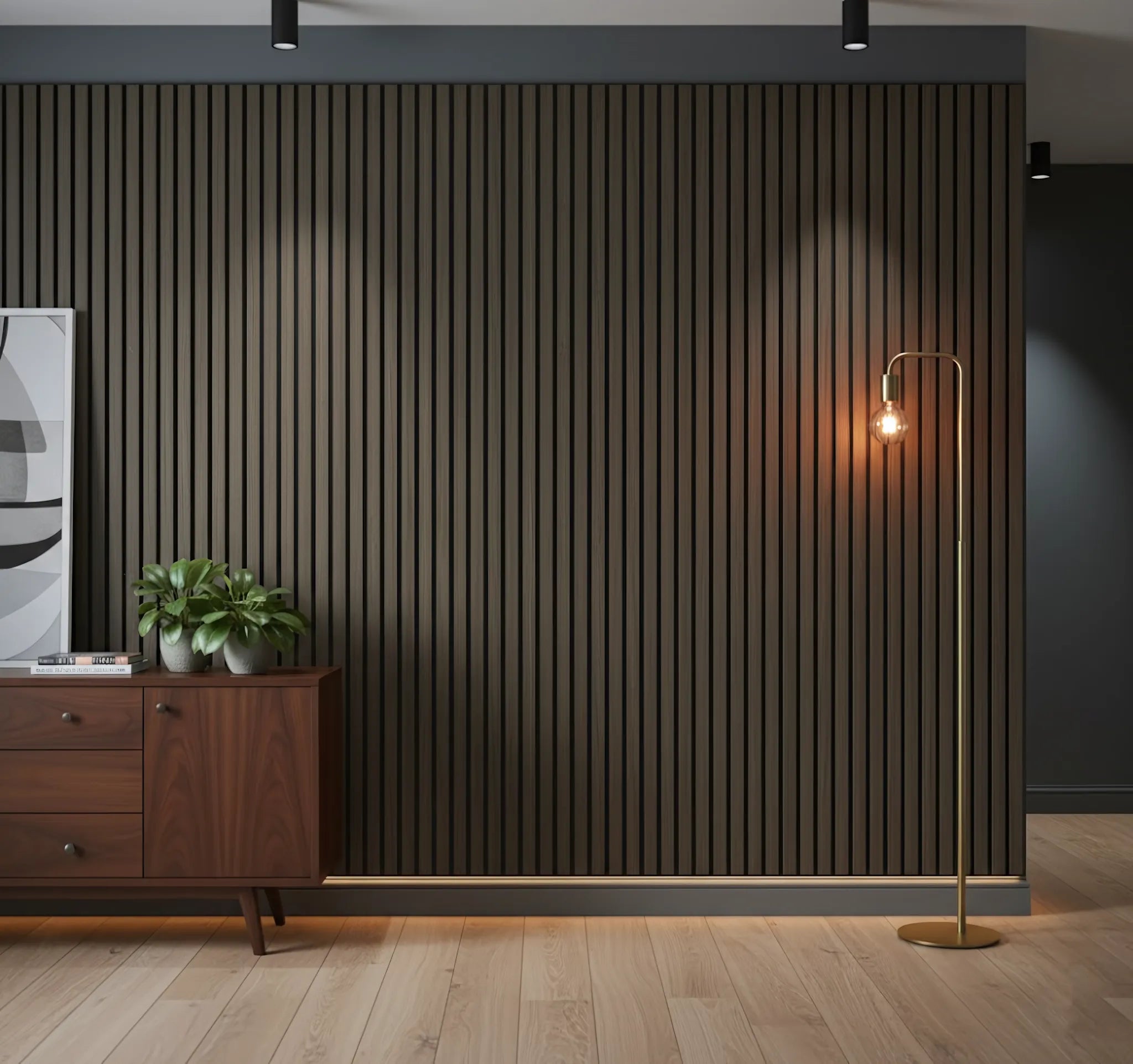Panou riflaj decorativ XYPT-13 – lamele verticale nuc închis pe bază neagră
