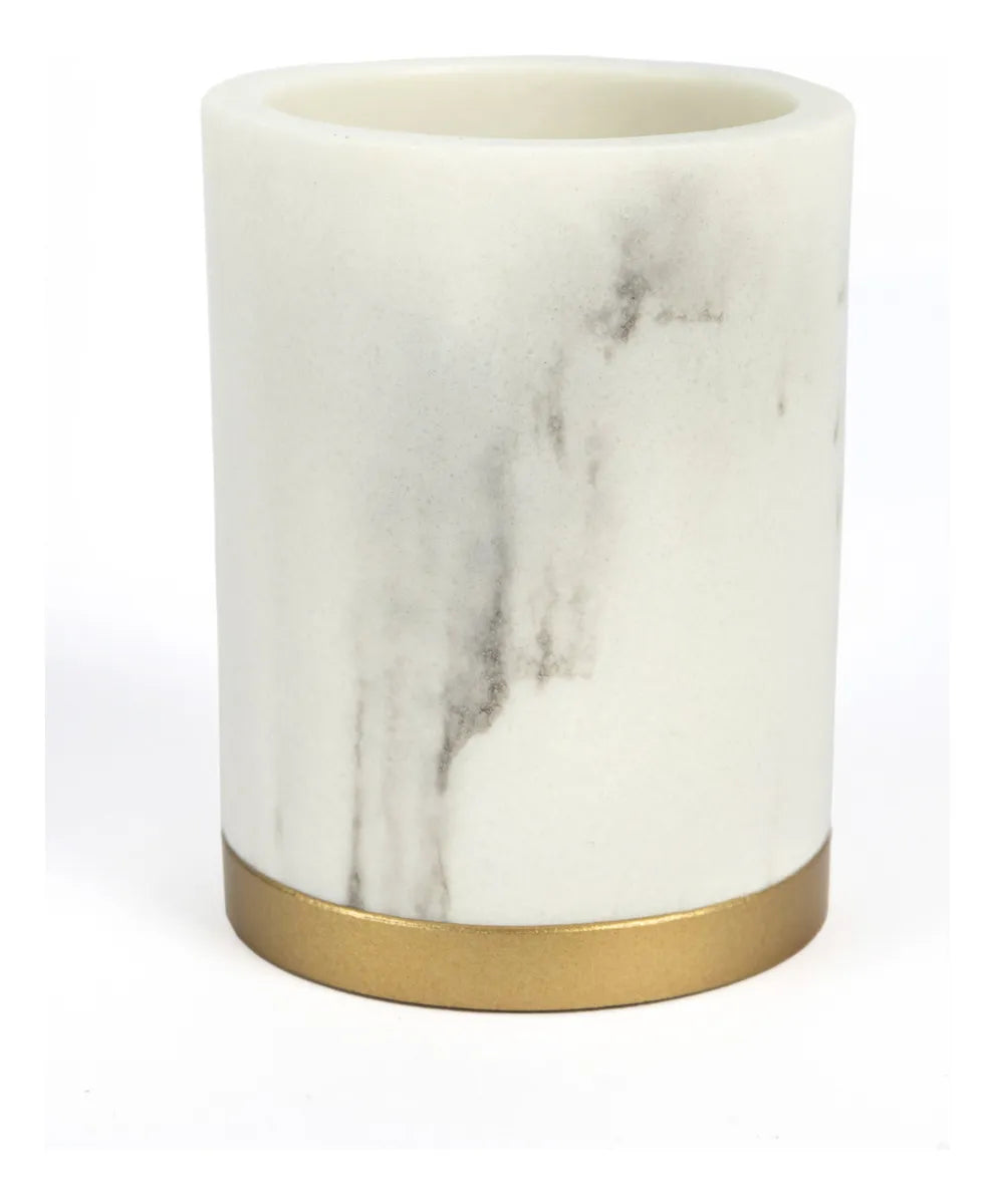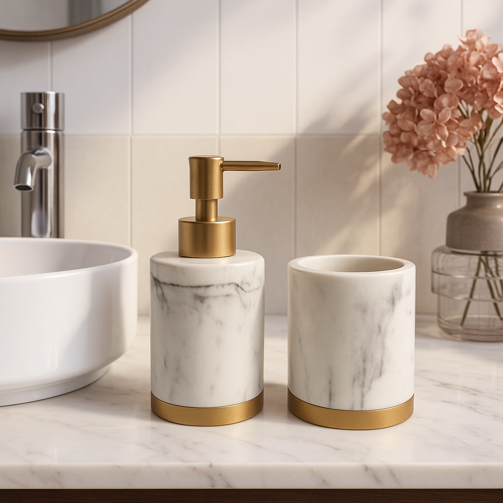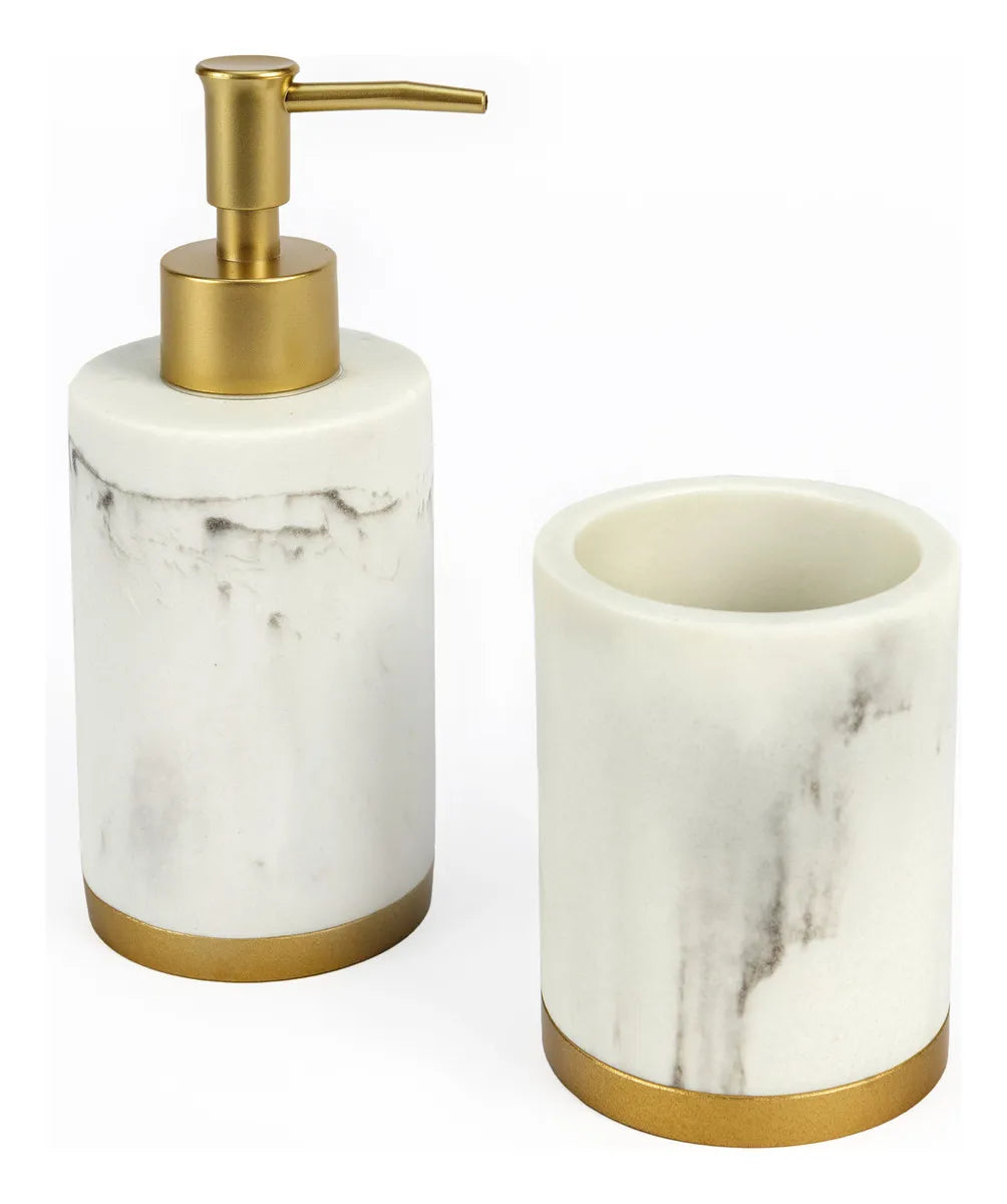 Adaugă un plus de stil băii tale cu acest set de accesorii din 2 piese, realizat din polirasină rezistentă. Cu efect marmorat alb și detalii aurii mate, setul aduce un aer luxos și modern în orice spațiu.