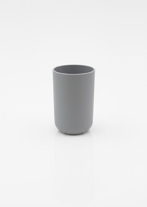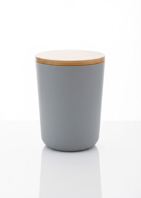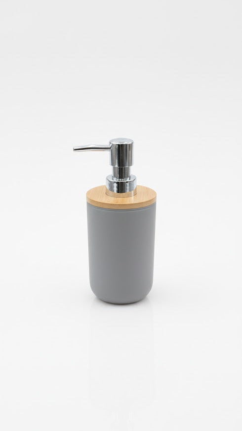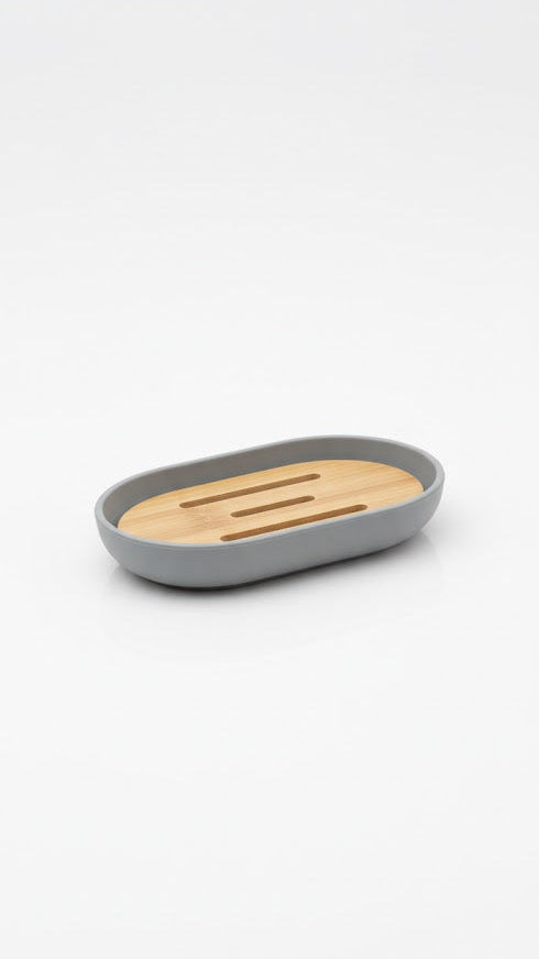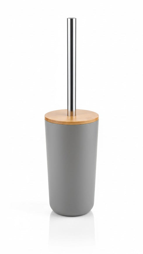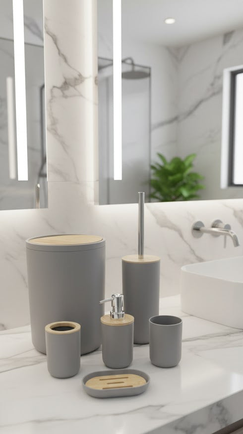 Set accesorii baie, cu accente lemnoase, SANITARY, 6 piese, gri cu detalii bej
