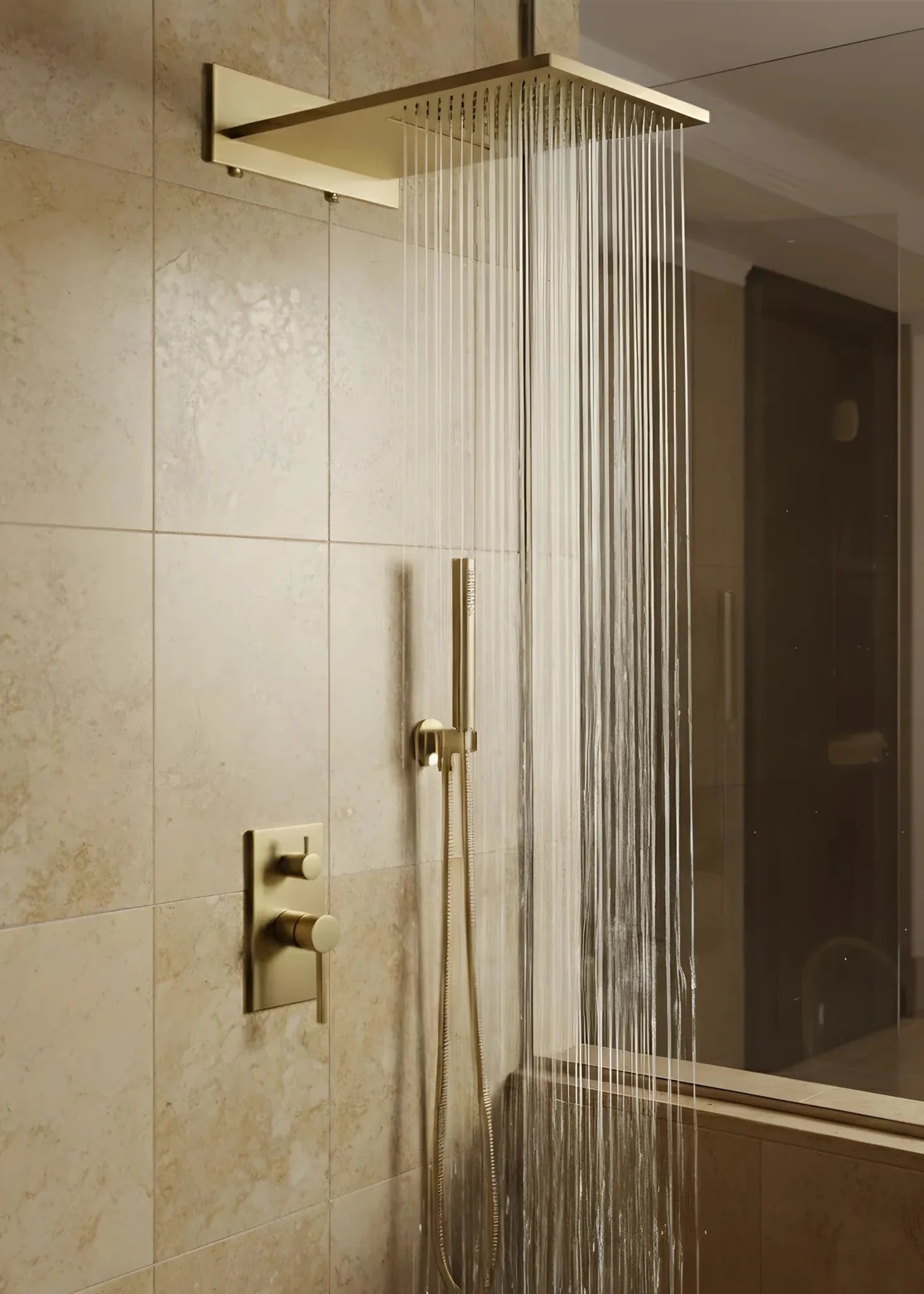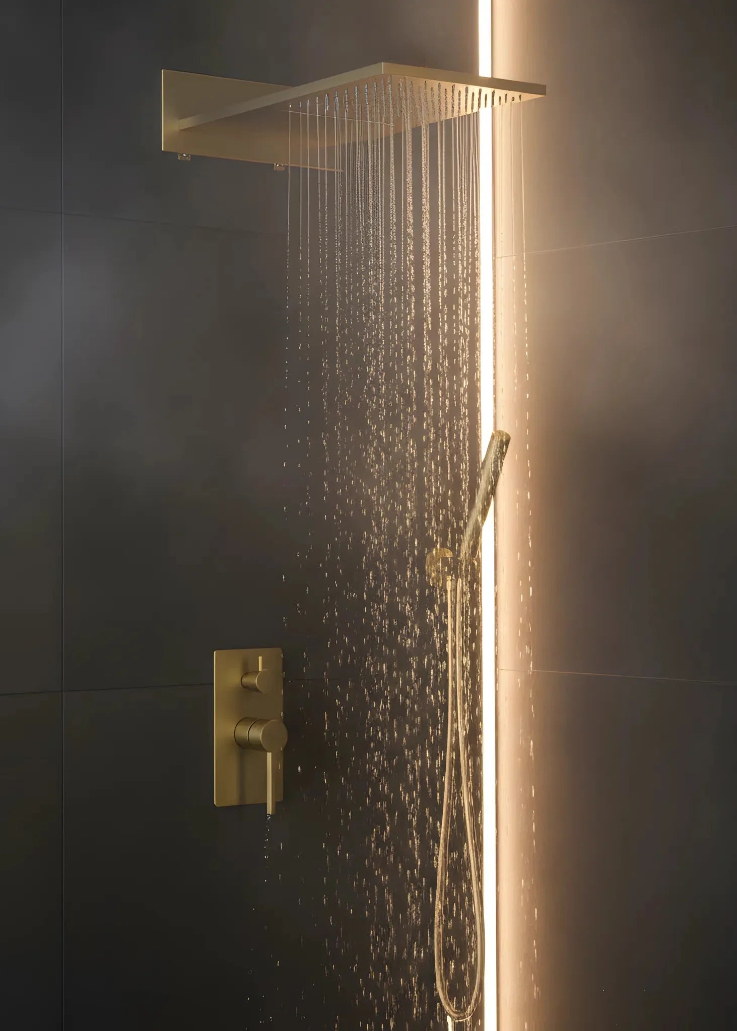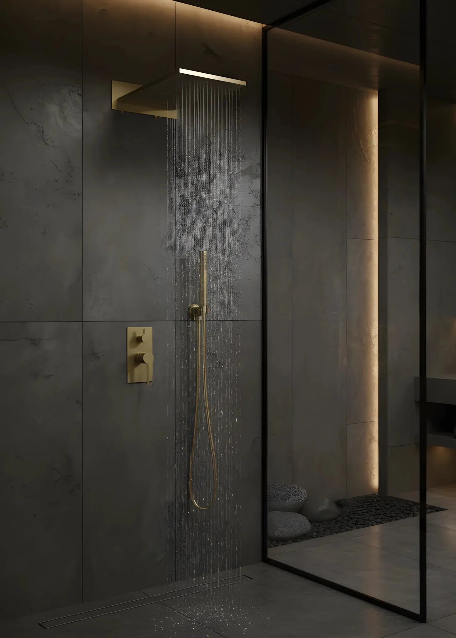 Un simbol al eleganței contemporane, acest set de duș încastrat în finisaj auriu periat transformă baia într-un spațiu sofisticat și rafinat. Realizat integral din alamă solidă, oferă durabilitate, confort și un design premium, perfect pentru interioarele moderne.