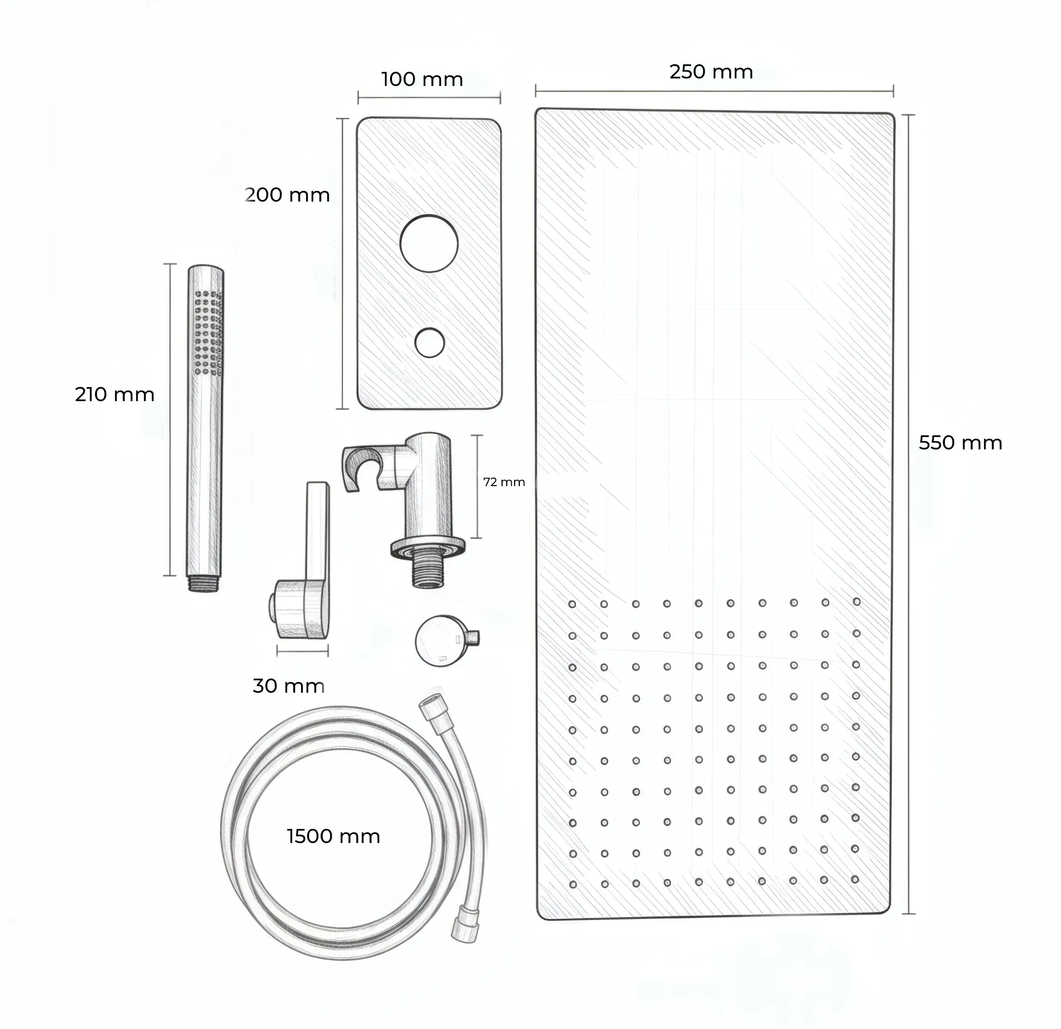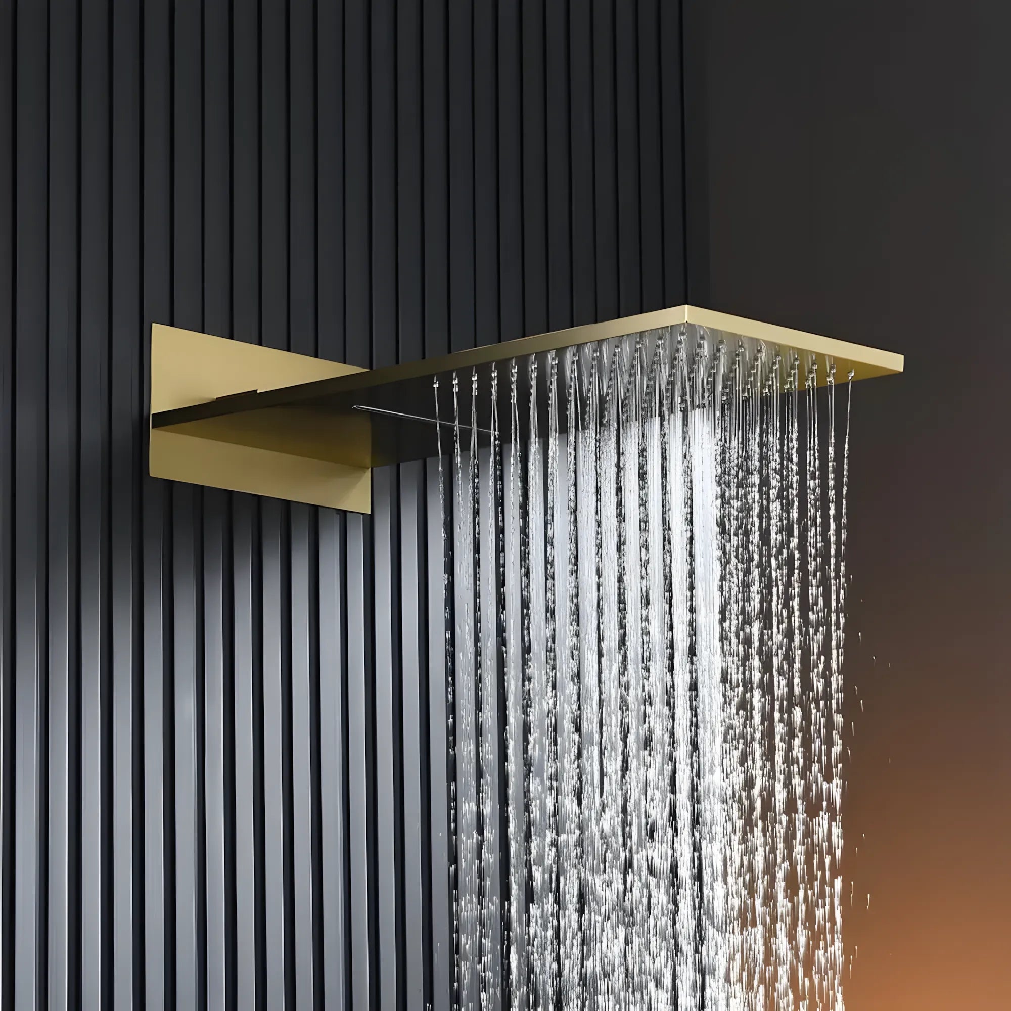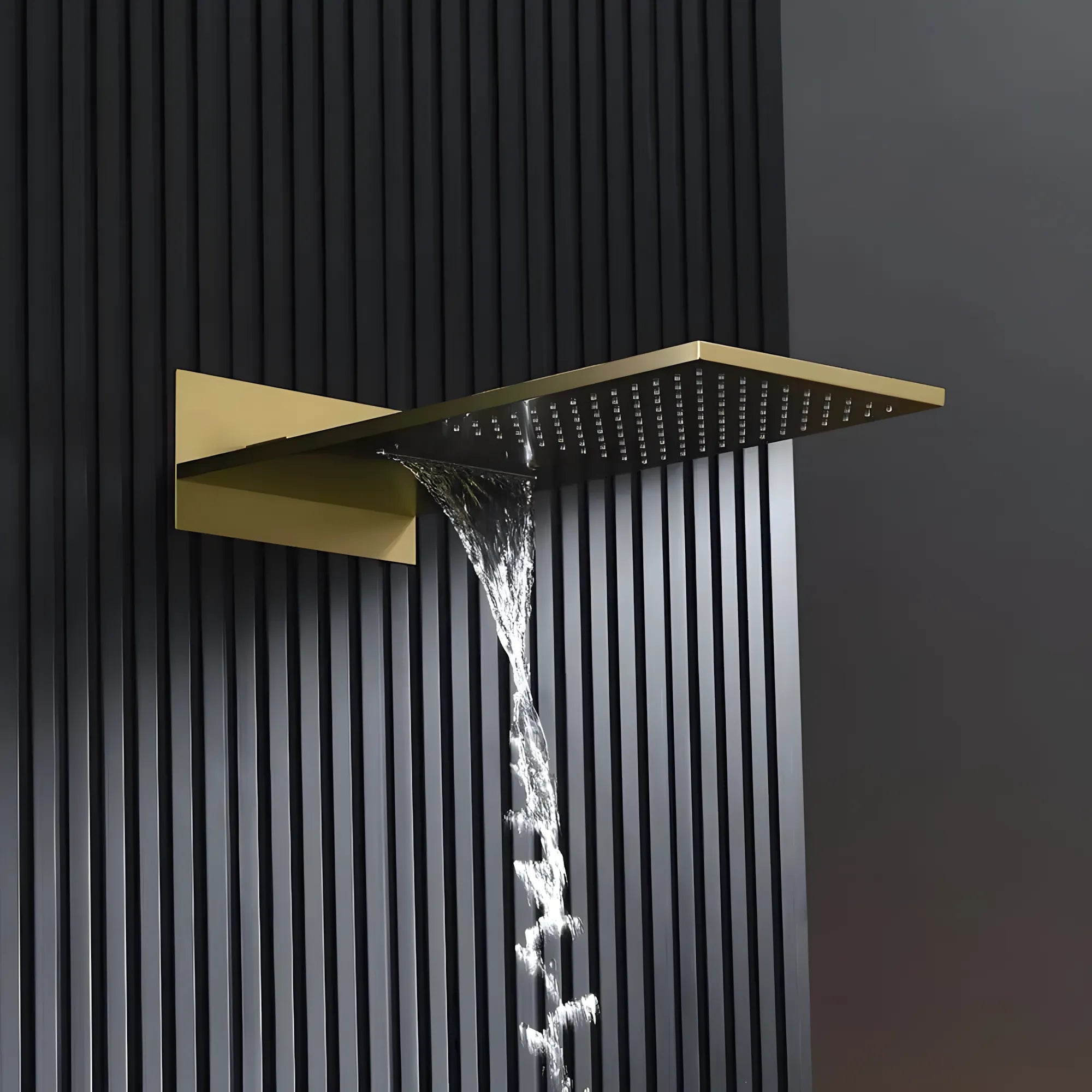 Un simbol al eleganței contemporane, acest set de duș încastrat în finisaj auriu periat transformă baia într-un spațiu sofisticat și rafinat. Realizat integral din alamă solidă, oferă durabilitate, confort și un design premium, perfect pentru interioarele moderne.