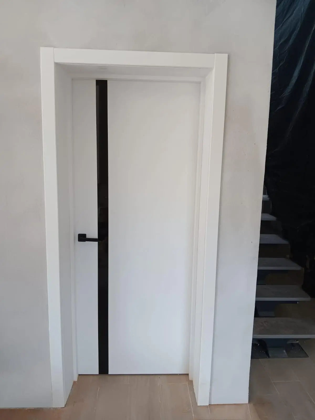 Ușă interior City White Silk Mat – cu sticlă neagră aplicată și toc reglabil, complet echipată