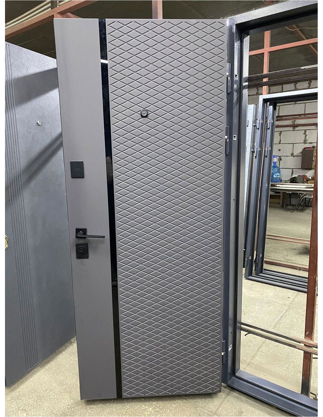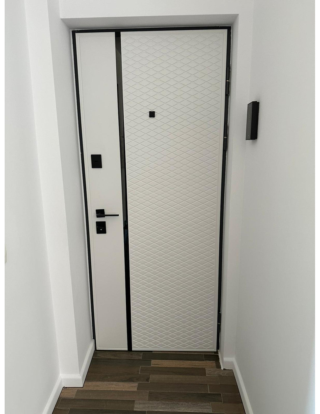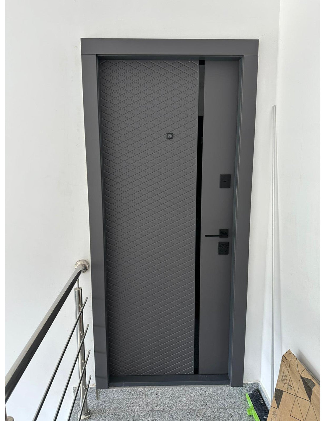Ușă de intrare în apartament cu design modern. Partea din exterior este finisată cu folie Soft touch foarte plăcută la...