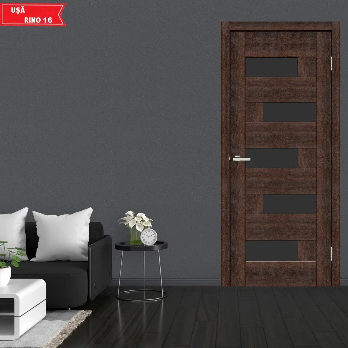 Ușă interior Rino 16 European Chestnut- cu sticlă decorativă, complet echipată